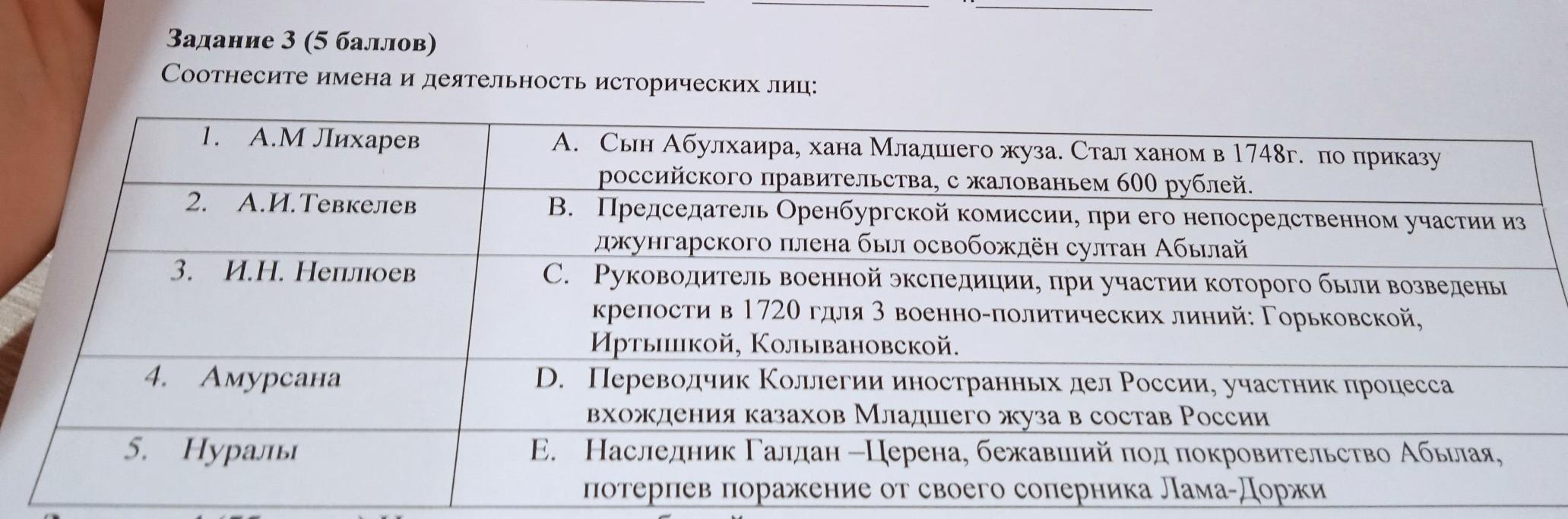 Соотнесите имена и деятельность исторических лиц: 1. А.М Лихарев 2. А.И.Тевкелев 3. И.Н. Неплюев 4. Амурсана 5. Нуралы А. Сын Абулхаира, хана Младшего жуза. Стал ханом в 1748г. по приказу российского правительства, с жалованьем 600 рублей. В. Председатель Оренбургской комиссии, при его непосредственном участии из джунгарского плена был освобождён султан Абылай C. Руководитель военной экспедиции, при участии которого были возведены крепости в 1720 гдля 3 военно-политических линий: Горьковской, Иртышкой, Колывановской. D. Переводчик Коллегии иностранных дел России, участник процесса вхождения казахов Младшего жуза в состав России E. Наследник Галдан-Церена, бежавший под покровительство Абылая, потерпев поражение от своего соперника Лама-Доржи Задание 4(5баллов) Напишите даты событий