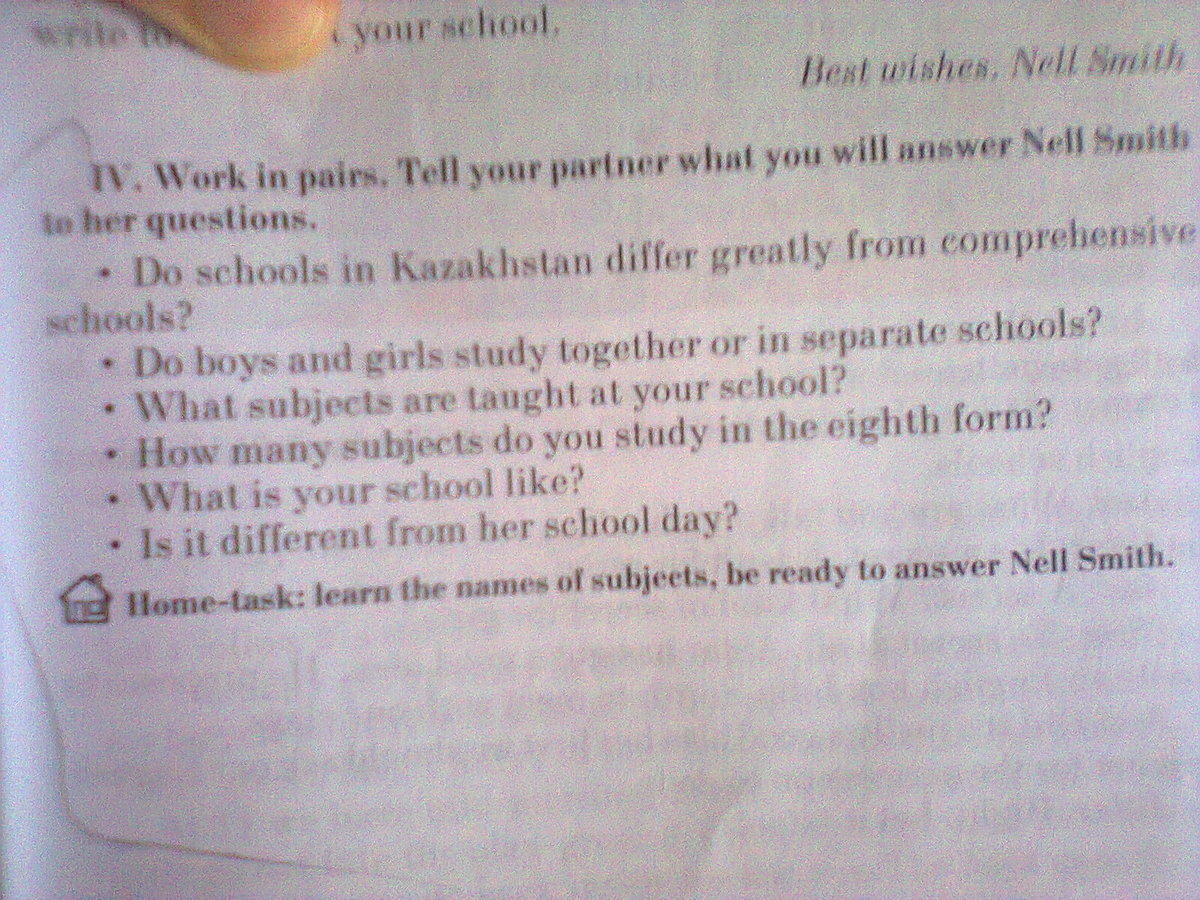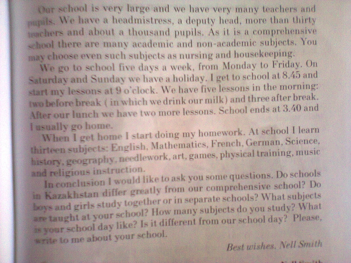 В завершении я хотела бы задать тебе несколько вопросов. Казахстанские школы сильно отличаются от нашей общеобразовательной школы? Какие предметы преподаются в вашей школе? Сколько предметов вы изучаете? Каков ваш учебный день? Он отличается от нашего школьного дня? Пожалуйста, напишите мне о вашей школе.