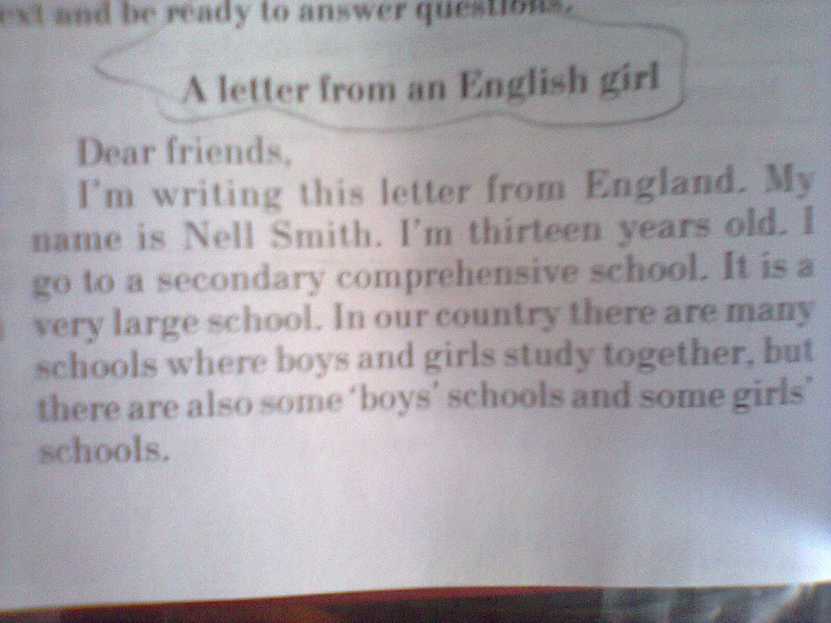 Я пишу это письмо из Англии. Меня зовут Нэл Смит. Мне тринадцать лет. Я учусь в средней общеобразовательной школе. Эта школа очень большая. В нашей стране есть множество школ, где мальчики и девочки учатся вместе, но так же здесь есть несколько школ для мальчиков и несколько школ для девочек.