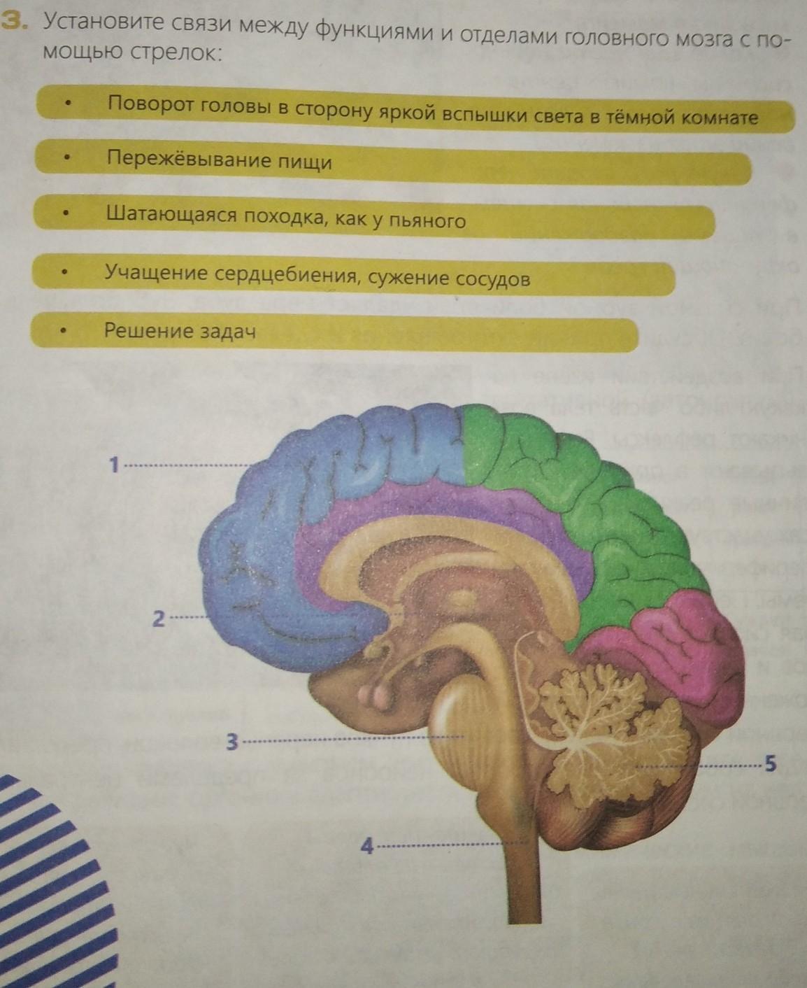 3. Установите связи между функциями и отделами головного мозга с по- мощью стрелок: Поворот головы в сторону яркой вспышки света в тёмной комнате Пережёвывание пищи Шатающаяся походка, как у пьяного Учащение сердцебиения, сужение сосудов Решение задач