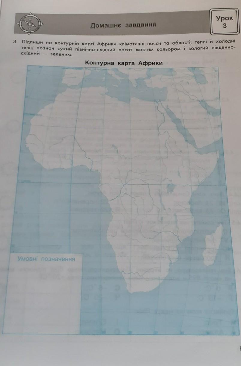 3. Підпиши на контурній карті Африки кліматичні пояси та областi, теплі й холодні течії; познач сухий північно-східний пасат жовтим кольором і вологий південно- східний зеленим. -