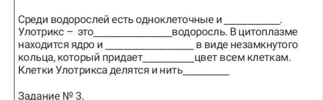 2. зеленая многоклеточная, зелёный хроматофор и крупная вакуоль, заполненная клеточным соком.
