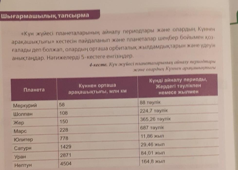 «Күн жүйесі планеталарынын айналу периодтары және олардың Күннен арақашықтығы» кестесін пайдаланып және планеталар шеңбер бойымен қоз- ғалады деп болжап, олардың орташа орбиталық жылдамдықтарын және үдеуін анықтаңдар. Нәтижелерді 5-кестеге енгiзiндер. Планета Меркурий Шолпан Жер Mapc Юпитер Сатурн Уран Нептун 4-кесте. Күн жүйесі планеталарының айналу периодтары және олардын күннен арақашықтығы Күннен орташа арақашықтығы, млн км 58 108 150 228 778 1429 2871 4504 Кунді айналу периоды, Жердегі тәулікпен немесе жылмен 88 тәулік 224,7 тәулiк 365,26 тәулiк 687 тәулік 11,86 жыл 29,46 жыл 84,01 жыл 164,8 жыл
