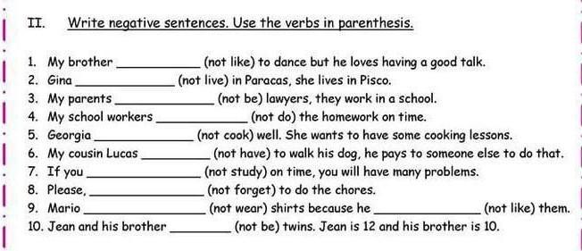 . II. Write negative sentences. Use the verbs in parenthesis. 1. My brother. 2. Gina 3. My parents. 4. My school workers. 5. Georgia. 6. My cousin Lucas 7. If you. 8. Please, 9. Mario. 10. Jean and his brother (not like) to dance but he loves having a good talk. (not live) in Paracas, she lives in Pisco. (not be) lawyers, they work in a school. (not do) the homework on time. (not cook) well. She wants to have some cooking lessons. (not have) to walk his dog, he pays to someone else to do that. (not study) on time, you will have many problems. (not forget) to do the chores. (not wear) shirts because he (not be) twins. Jean is 12 and his brother is 10. (not like) them.