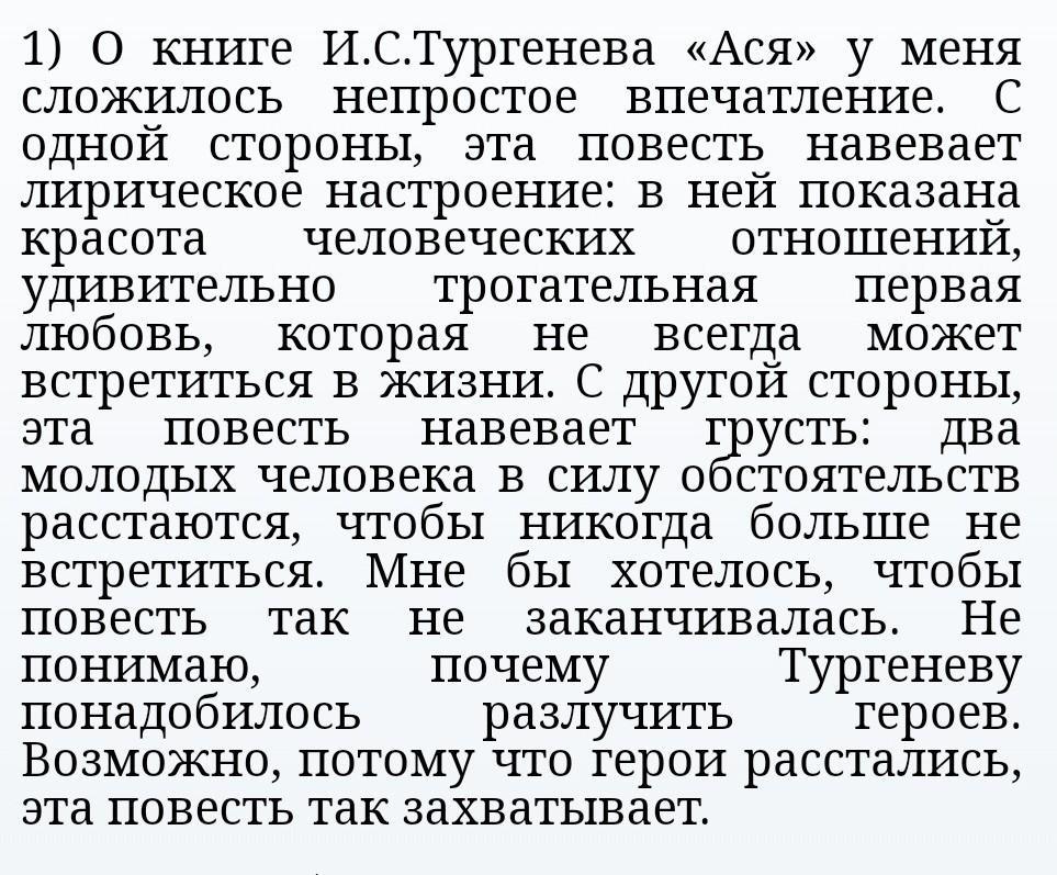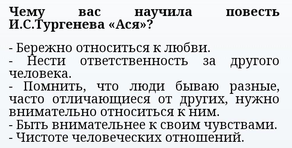 1. Какое впечатление произвела на вас повесть И. С. Тургенева "Ася"? 2. Каково ваше отношение к героям? Какие чувства вызвали у вас их по- ступки? 3. Почему повесть называется "Ася"? Каково настоящее имя главной героини? 4. В произведениях русских классиков неоднократно встречается понятие "первая любовь". Составьте ментальную карту, отражающую ваше по- нимание этого понятия.