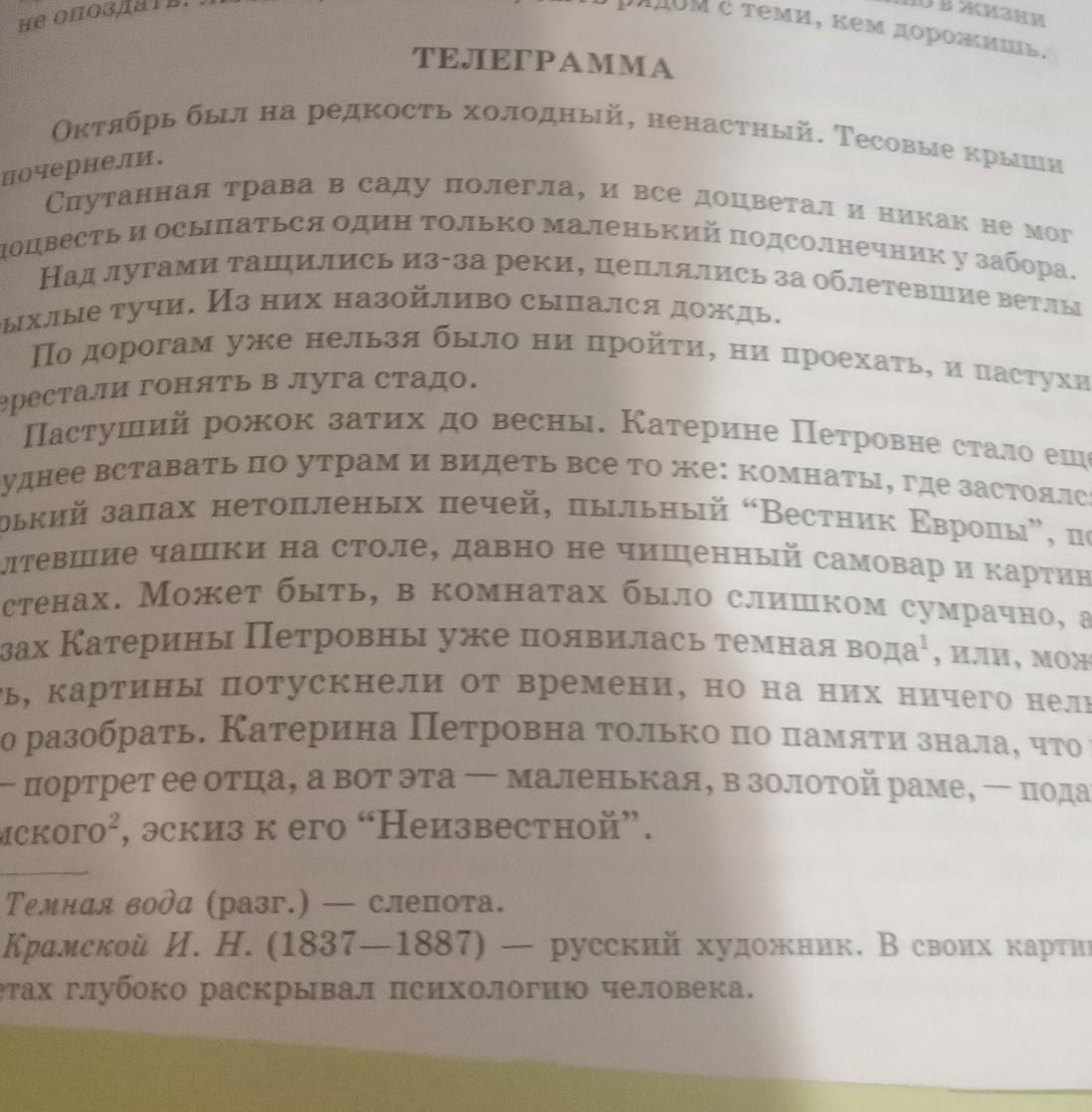 ТЕЛЕГРАМMA Октябрь был на редкость холодный, ненастный. Тесовые крыш очернели. У Спутанная трава в саду полегла, и все доцветал и никак не цвесть и осыпаться ОДИН только маленький подсолнечник у забс Над лугами тащились из-за реки, цеплялись за облетевшие ве хлые тучи. Из них назойливо сыпался дождь. По дорогам уже нельзя было ни пройти, ни проехать, и пас стали гонять в луга стадо. Пастуший рожок затих до весны. Катерине Петровне стало днее вставать по утрам и видеть все то же: комнаты, где застс ький запах нетопленых печей, пыльный “Вестник Европы тевшие чашки на столе, давно не чищенный самовар и кар тенах. Может быть, в комнатах было слишком сумрачн ах Катерины Петровны уже появилась темная вода¹, или, -, картины потускнели от времени, но на них ничего разобрать. Катерина Петровна только по памяти знала, маленькая, в золотой раме, портрет ее отца, а вот эта ского², эскиз к его "Неизвестной". Темная вода (разг.) - - слепота. Срамской И. Н. (1837-1887) ах глубоко раскрывал психологию человека. дорожиш - - русский художник. В своих ка