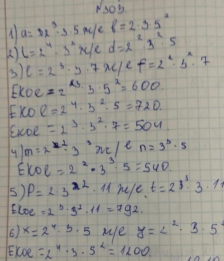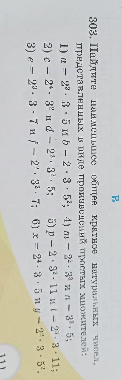 В 303. Найдите наименьшее общее кратное натуральных чисел, представленных в виде произведений простых множителей: 23. 3 · 5 и b = 2 · 3 .3 . · 4) m = 22 . 33 и п = 33 . 5; 5) p = 2 · 32 . 11 и t = 23 . 3 . 11; - 1) a = 2) с = 24 . 32 и d = 22 . 32. 5; 3) e = 23 . - 3 · 7 и f = 22 . 32 . 7; = 52; 6) x = 24 . 3 . 5 и у = 22 . 3 . 52. - - 111