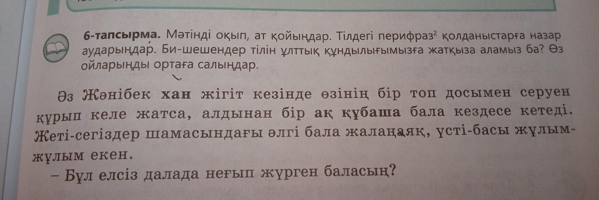 мәтінді оқып, ат қойындар. тілдегі перифраз² қолданыстарға назар аударындар. би шешендер тілін ұлттық құндылығымызға жатқыза аламыз ба? өз ойларын ды ортаға салындар.