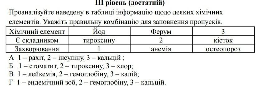 1- ендкомічний зоб, 2- гемоглобіну, 3- кальцій.
