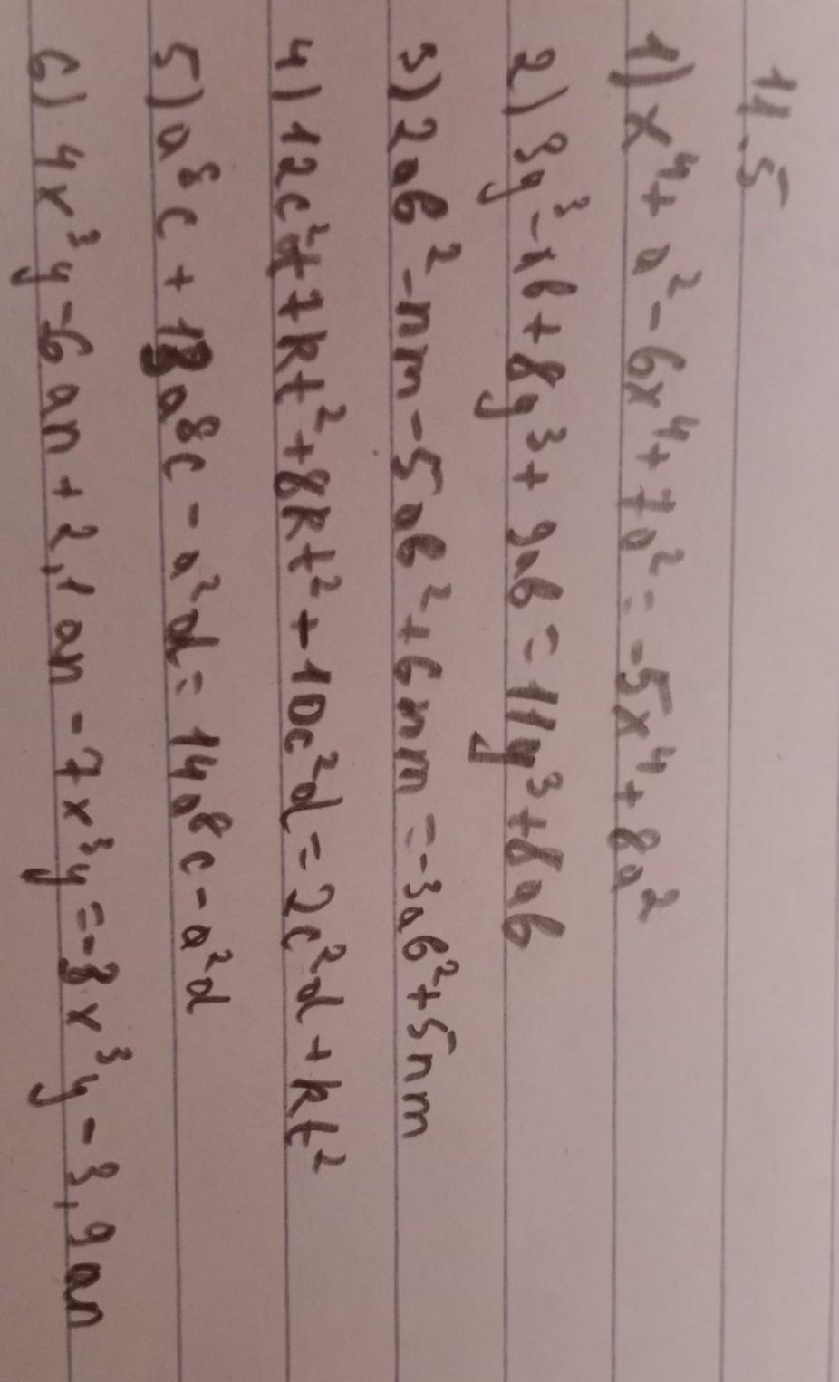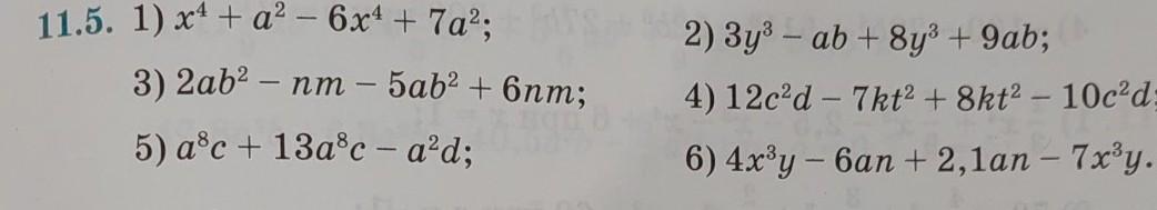 11.5. 1) x¹ + a² - 6x4 + 7a²; 3) 2ab² - nm - 5ab² + 6nm; 5) a³c + 13a³c - a²d; 2) 3y³ - ab + 8y³ +9ab; 4) 12c²d7kt2 + 8kt2-10c²d; 6) 4x³y - 6an + 2,1an - 7x³y.помогите срочно20 баллов