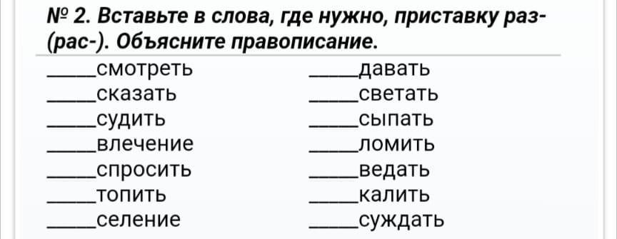 2) Разсказать 3) Рассудить 4)Развлечение 5) Расспросить 6)Разстопить 7) Разселение 8) Раздавать 9) Рассветать 10)Разсыпать 11)Разломить 12) Разведать 13)Расскалить 14)Рассуждать Проверочные слова,от туда я и беру все эти приставки.