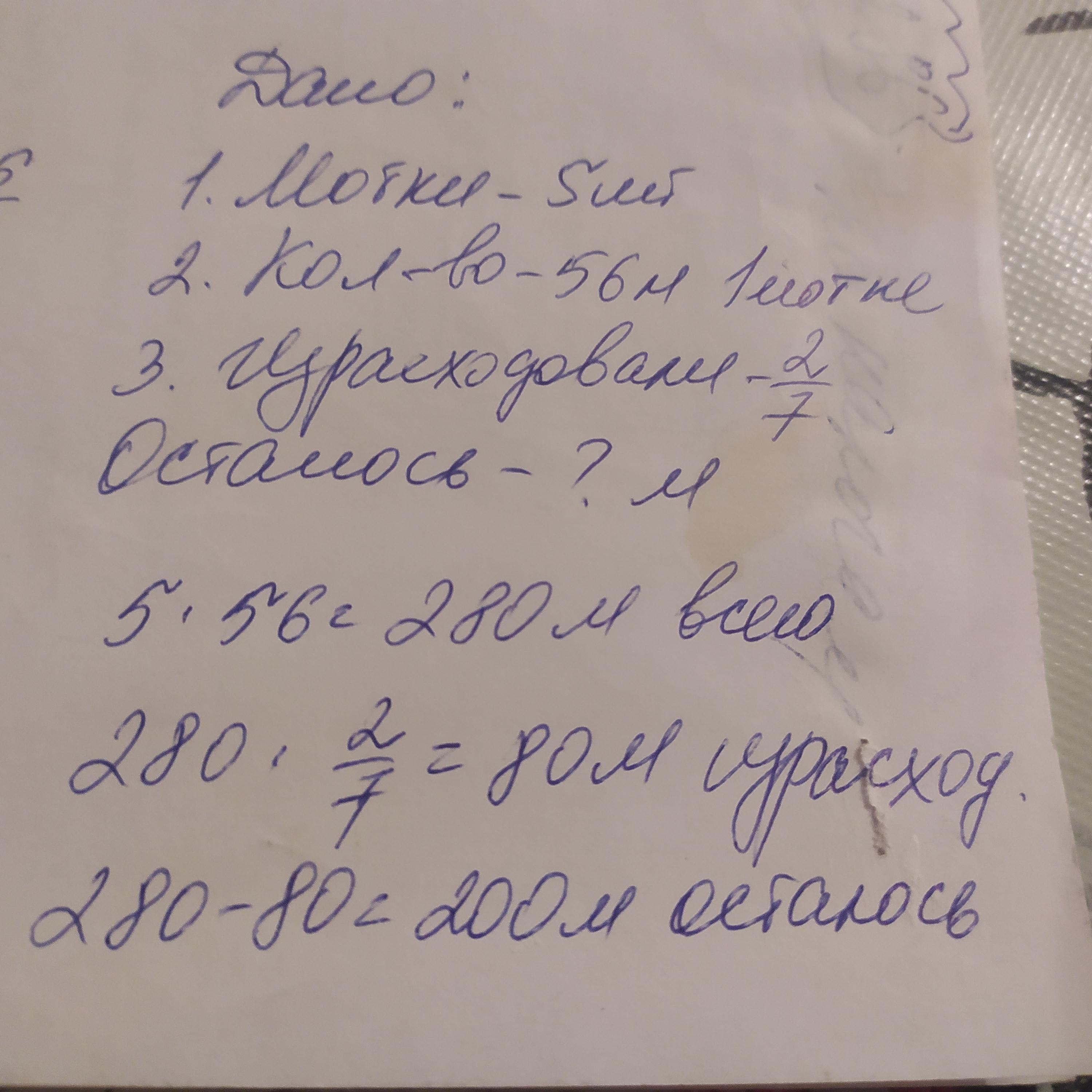 Для школы купили пять мотков электрического провода по 56 м в каждом израсходовали две седьмых части всего провода сколько метров провода осталось?