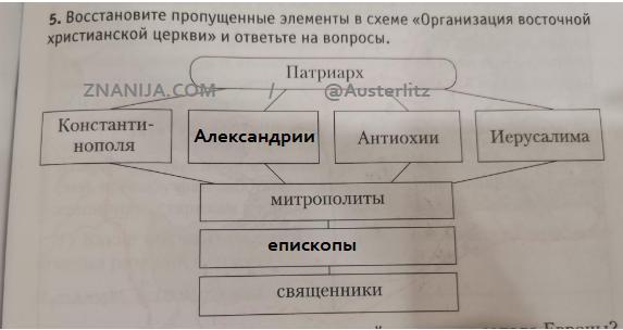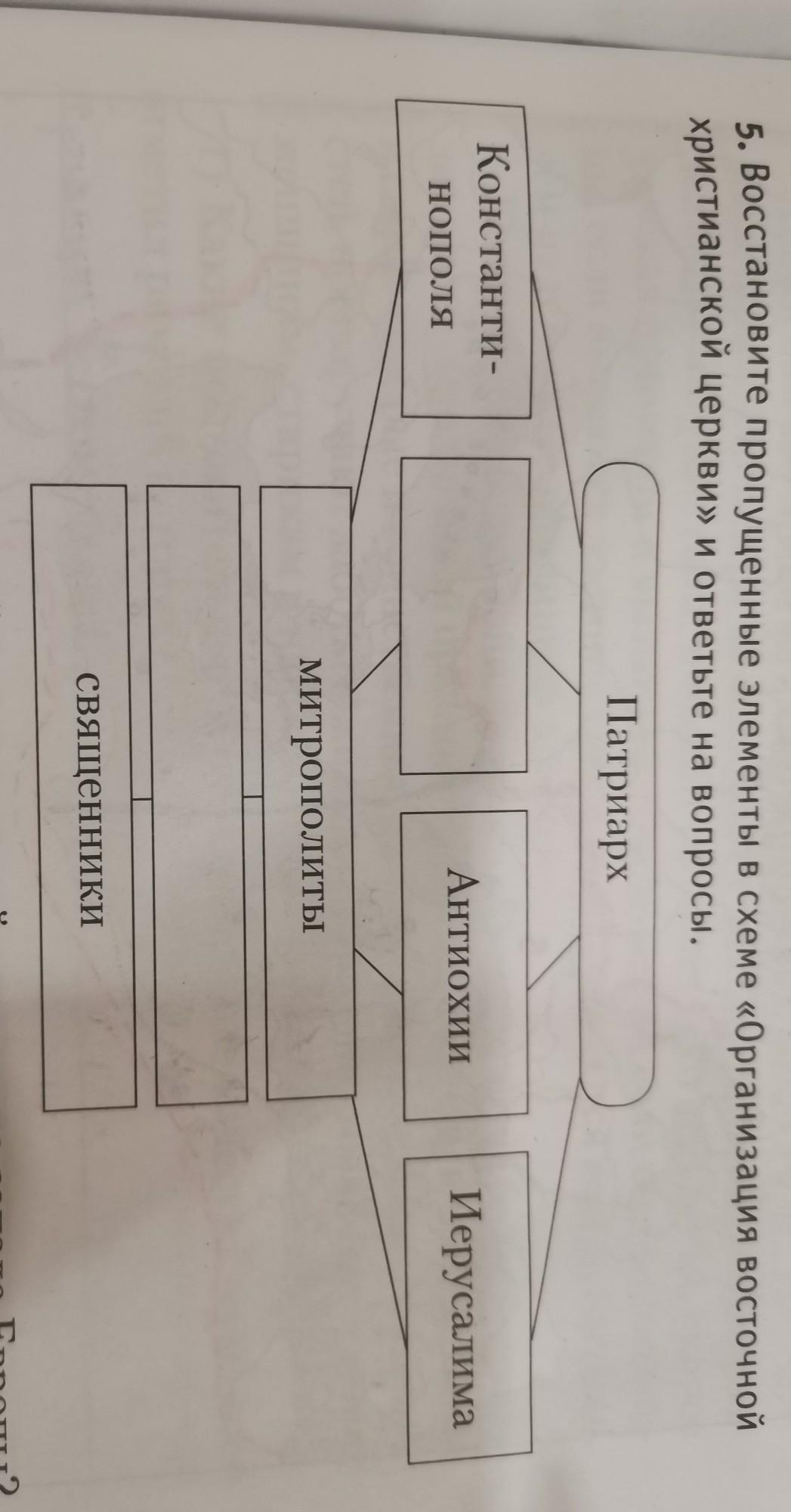 5. Восстановите пропущенные элементы в схеме «Организация восточной христианской церкви» и ответьте на вопросы. Патриарх Константи- НОПОЛЯ Антиохии митрополиты священнИКИ Иерусалима