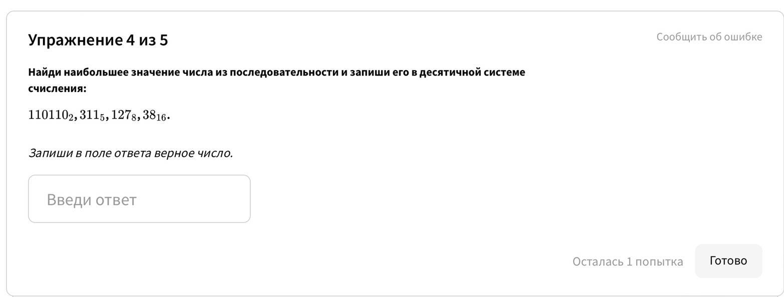 Найди наибольшее значение числа из последовательности и запиши его в десятичной системе счисления: