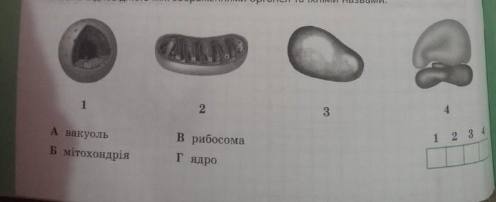 Установіть відповiднiсть мiж зображеннями органел та їхніми назвами. А вакуоль Б мітохондрія 2 B paбocoMa Г ядро
