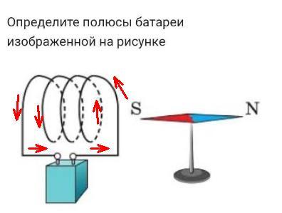 Таким образом, если обхватить катушку на рисунке правой рукой так, чтобы оставленный большой палец был направлен вправо (к северному полюсу), остальные пальца укажут направление тока в катушке (см. вложение). Отсюда следует, что ток в катушке протекает от правого полюса батареи к левому. По общепринятым обозначениям, ток течет от + к -. Отсюда следует, то у батареи справа +, а слева -.