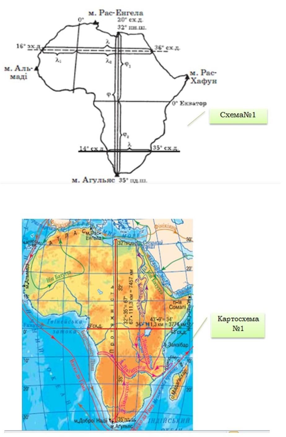 Користуючись схемою №1 та картосхемою №1 обчисліть протяжність материка у градусах і кілометрах уздовж: