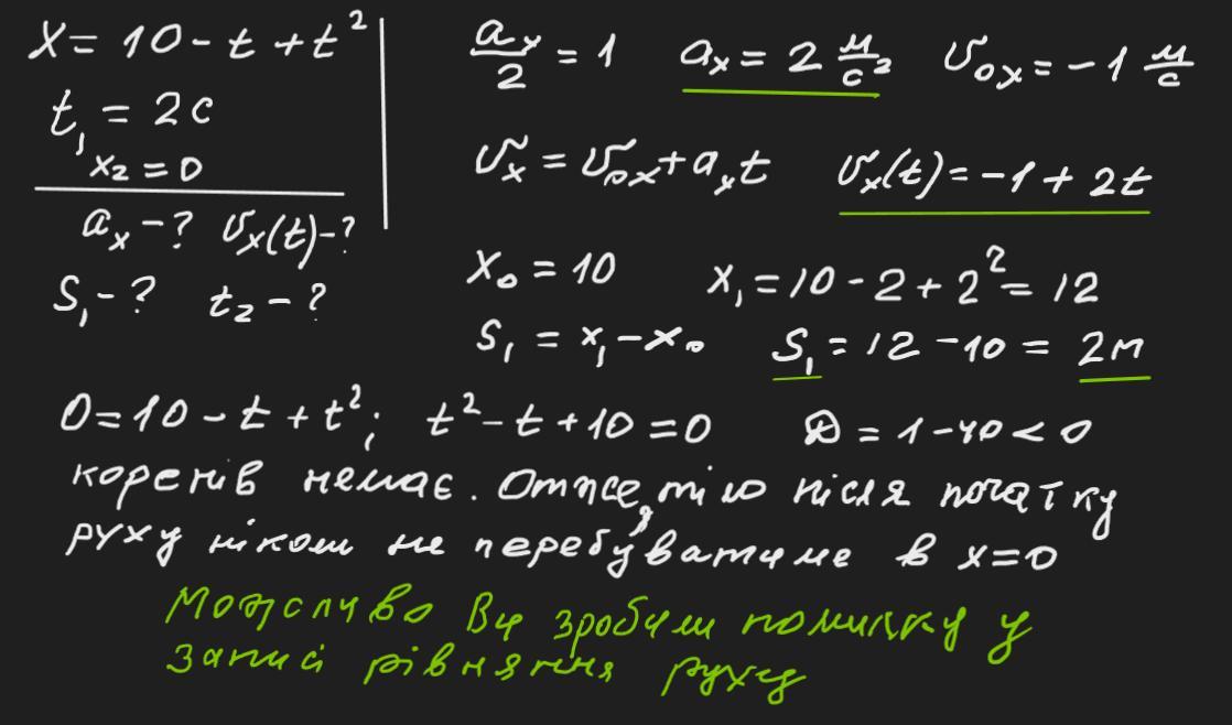 Прямолінійний рух тіла описується рівнянням руху x=10-t+t2(м). Знайти прискорення тіла.Написати рівняння швидкості даного руху. Яке переміщення здійснить тіло за перші 2 с руху? Через який час від початку руху тіла його координата буде рівна нулю.