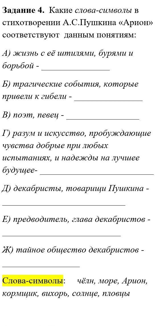 Задание 4. Какие слова-символы в стихотворении А.С.Пушкина «Арион» соответствуют данным понятиям:
