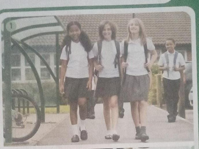 Здесь три подруги с хорошим настроением идут вместе в школу