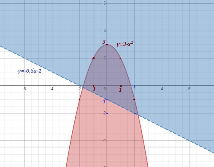 - это часть плоскости, расположенная выше прямой у=-0,5х-1 (полуплоскость) , причём сама прямая в область не входит, поэтому нарисована пунктирной линией . Прямая проходит через точки (0;-1) и (2;-2) . Полуплоскость закрашена синим цветом .