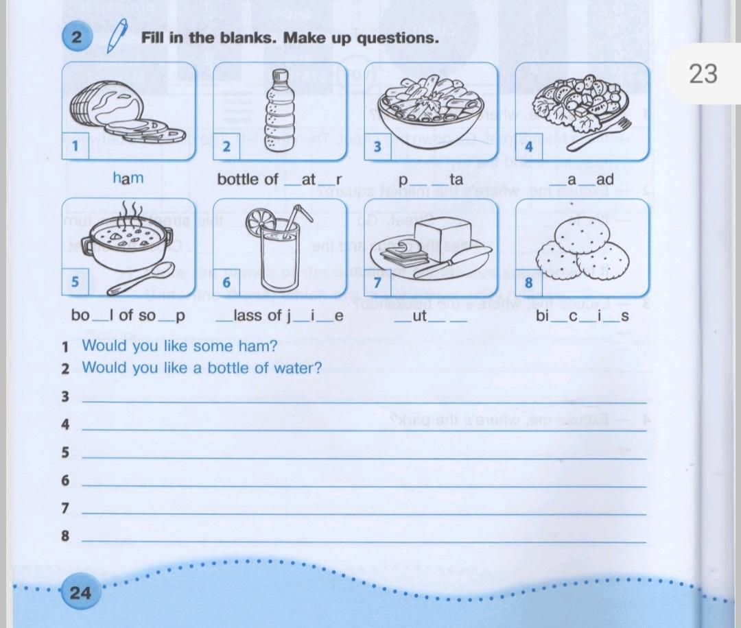 2. bottle of water 3. pasta 4. - 5. boil of soup 6. glass of juice 7. butter 8. biscuits