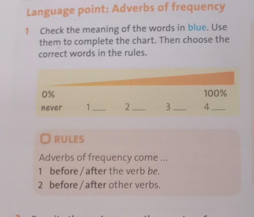 Lar 1 Check the meaning of the words in blue. Use them to complete the chart. Then choose the correct words in the rules. 0% never 100% 1 2 3 4_ O RULES Adverbs of frequency come... 1 before/after the verb be. 2 before/after other verbs.