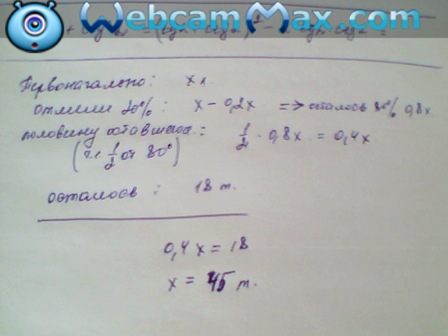 из цистерны отлили 20% бензина а затем половину оставшегося кол-ва.в результате в цистерне осталось18т бензина.Сколько тонн бензина было первоначально?