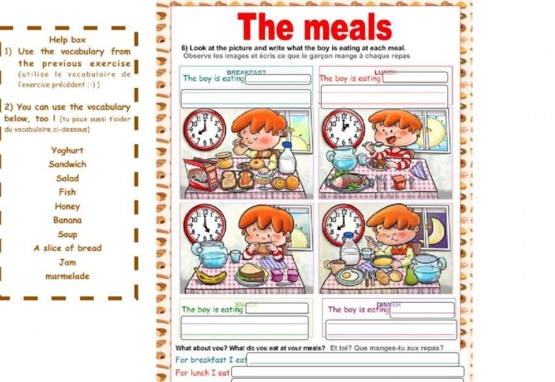 Breakfast) The boy is eating honey, sandwich, a slice of bread, jam, marmelade.