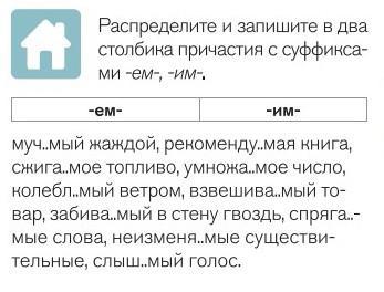 Распределите и запишите в два столбика причастия с суффикса- ми -ем-, -им-. -ем- муч.мый жаждой, рекоменду..мая книга, сжига.мое топливо, умножа..мое число, колебл.мый ветром, взвешива..мый то- вар, забива..мый в стену гвоздь, спряга.- мые слова, неизменя..мые существи- тельные, слыш..мый голос. -им-