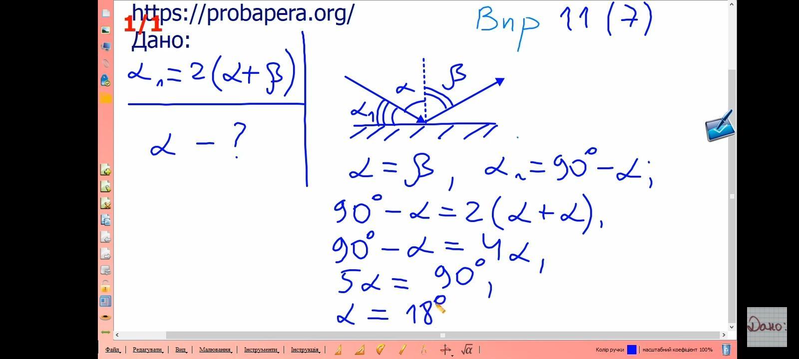 Сонячний промінь відбивається від поверхні озера. Кут між падаючим променем та горизонтом у три рази більший ніж кут між падаючим та відбитим променями. Чому дорівнює кут падіння променя?