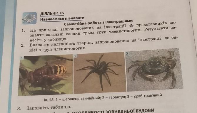 1. На прикладі запропонованих на ілюстрації 48 предст значте загальні ознаки трьох груп членистоногих. Результати за- несіть у таблицю. 2. Визначте належність тварин, запропонованих на ілюстрації, до однієї з груп членистоногих.