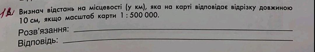 Визнач відстань на місцевості (у км), яка на карті відповідає відрізку довжиною 10 см, якщо масштаб карти 1:500 000.