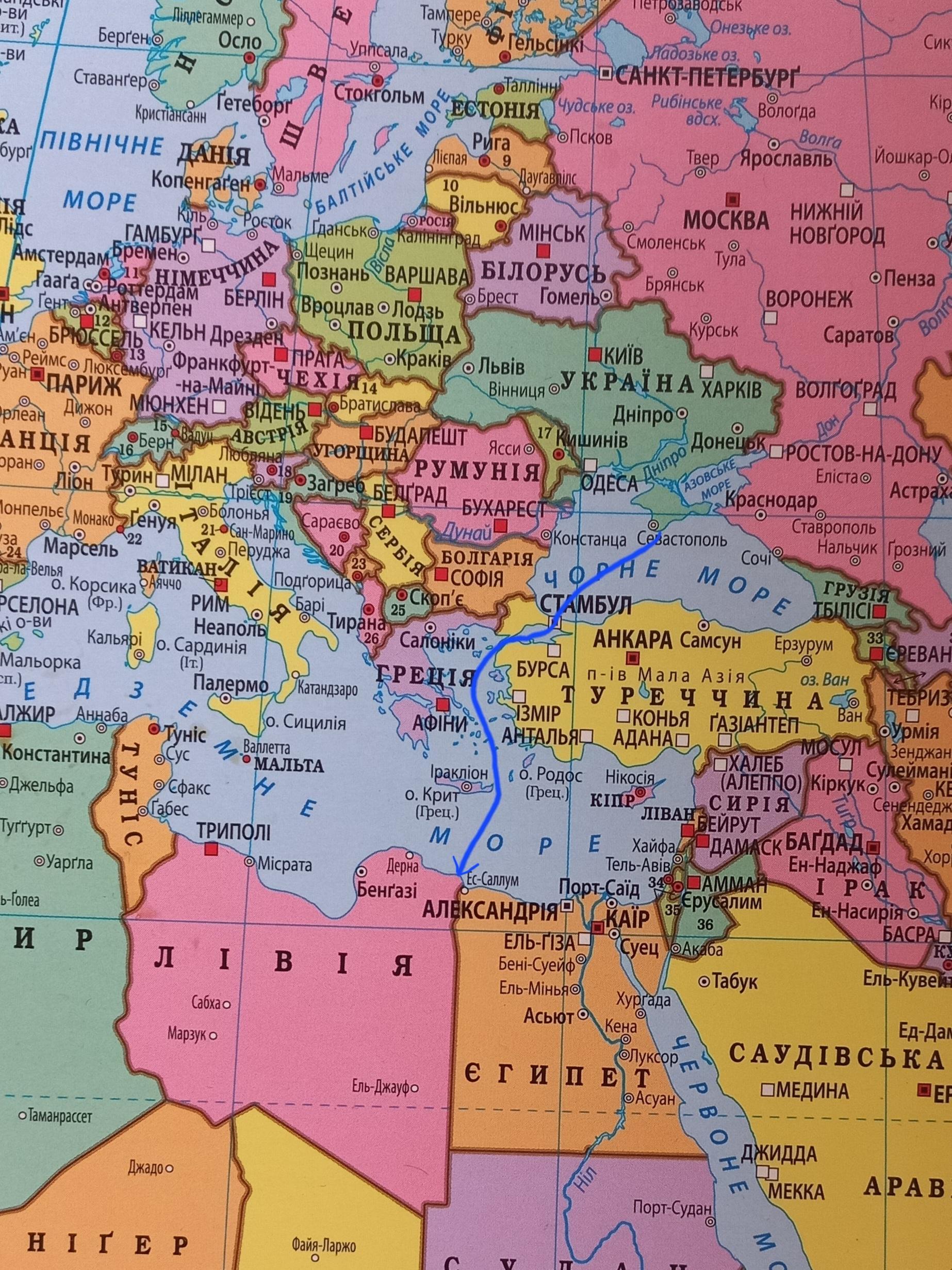 Користуючись картами атласу, знайдіть найкоротший водний шлях сполучення Африки з Україною і позначте його на контурній карті.