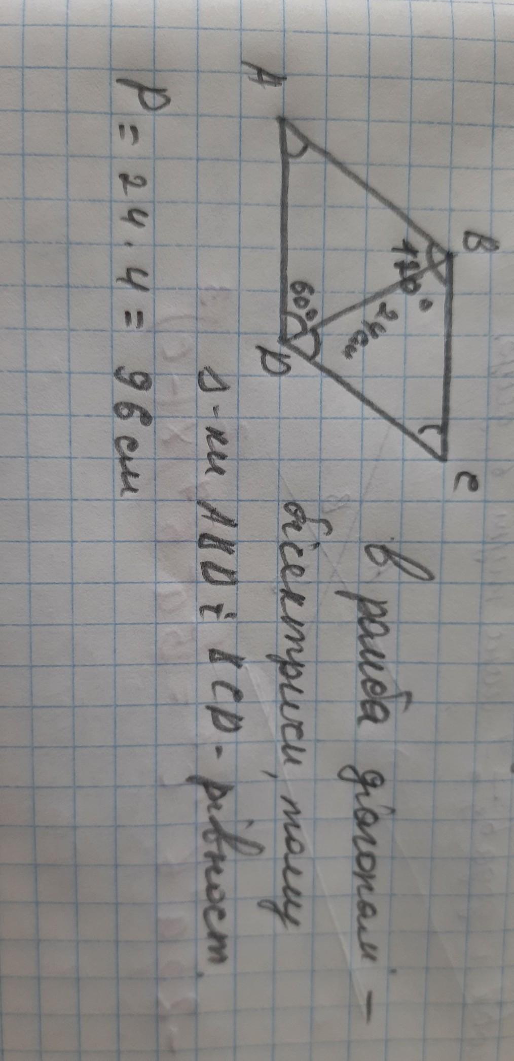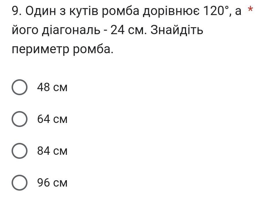 9. Один з кутів ромба дорівнює 120°, а * його діагональ - 24 см. Знайдіть периметр ромба. о 48 см О 64 см о 84 см о 96 см