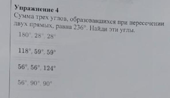 Упражнение 4 Сумма трех углов, образовавшихся при пересечении двух прямых, равна 236° Найди эти углы