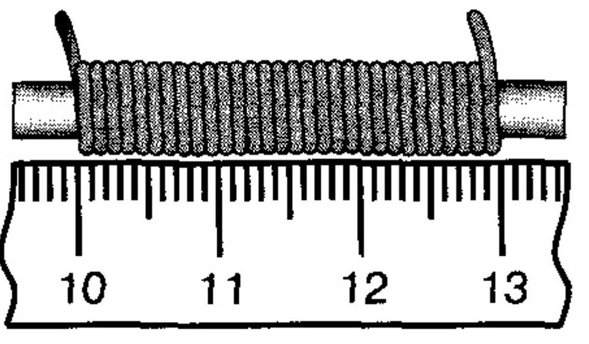 Щоб дізнатися діаметр тонкого дроту, дріт намотали на учнівську лінійку (див. рисунок). Визначте ціну поділки шкали лінійки. Обчисліть діаметр дроту.