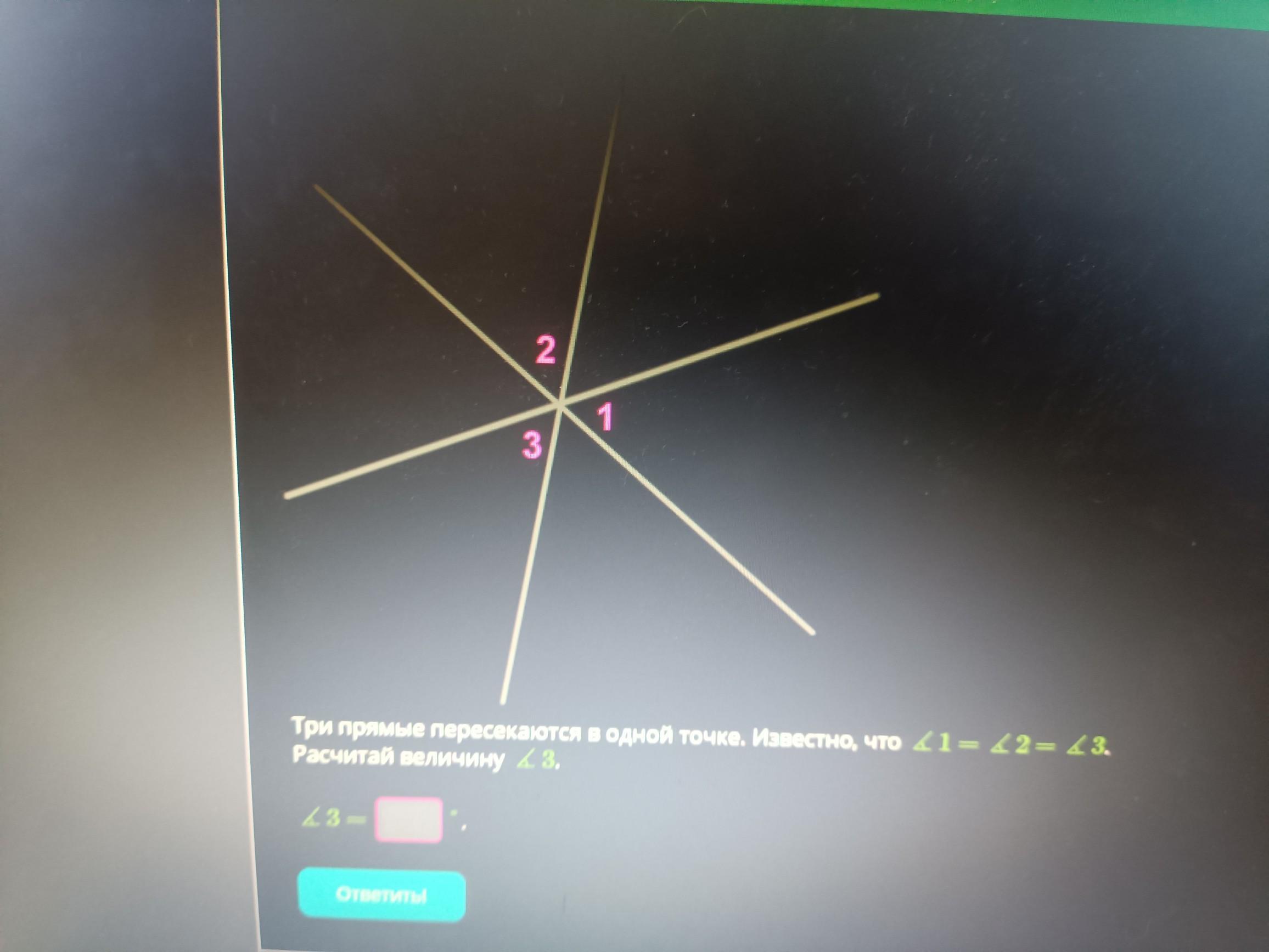 Кут 1= кут 2= кут 3= 180° ÷ 3= 60°