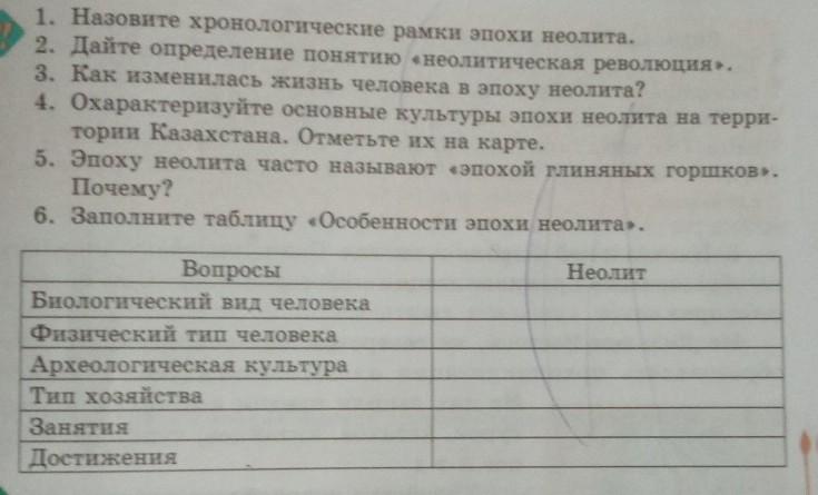 1. Назовите хронологические рамки эпохи неолита. 2. Дайте определение понятию/«неолитическая революция». 3. Как изменилась жизнь человека в эпоху неолита? 4. Охарактеризуйте основные культуры эпохи неолита на терри- тории Казахстана. Отметьте их на карте. 5. Эпоху неолита часто называют «эпохой глиняных горшков». Почему? 6. Заполните таблицу «Особенности эпохи неолита». Неолит Вопросы Биологический вид человека Физический тип человека Археологическая культура Тип хозяйства Занятия Достижения Обсудите в парах. Какое хозяйство лучше: присваивающее или производящее? Поче- му? К чему привело развитие производящего хозяйства? тие.