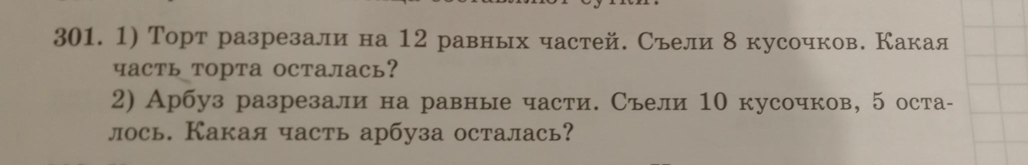 301. 1) Торт разрезали на 12 равных частей. Съели 8 кусочков. Какая часть торта осталась? 2) Арбуз разрезали на равные части. Съели 10 кусочков, 5 оста- лось. Какая часть арбуза осталась дам 20 баллов