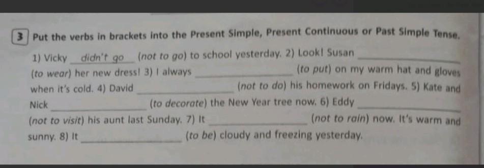 Ответ: wearing,put,doesn*t do, decorating,didn*t visited isn*t rain,was