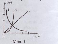 Який із схематично зображених графіків (мал.1) відображає вольт амперну характеристику напівпровідникового діода?