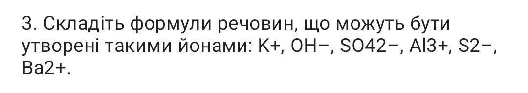 3. Складіть формули речовин, що можуть бути утворені такими йонами: К+, ОН–, SO42-, Al3+, S2-, Ba2+.
