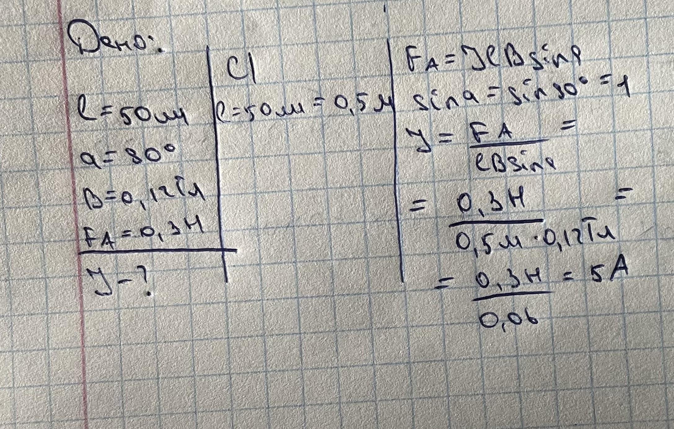 Розв'язати задачу та записати розв'язок Визначити силу струму в провіднику довжиною 20 см, розташованому перпендикулярно силовим лініям магнітного поля з індукцією 0,06 Тл, якщо на нього з боку магнітно о поля діє сила 0,48 Н.