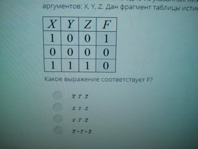 Символом F обозначено одно из указанных ниже логических выражений от трех аргументов: X, Y, Z. Дан фрагмент таблицы истинности выражения F: