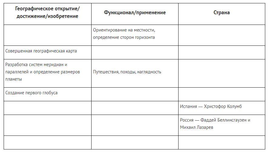Определите географические достижения/открытия и страну-первооткрывателя. Заполните пропуски в таблице. В последней пустой строке предложите свой вариант.
