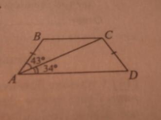 Найдите градусную меру большего из углов равнобедренной трапеции ABCD, если диагональ AC образует с основанием AD и боковой стороной АВ углы,равные 34° и 43° соответственно
