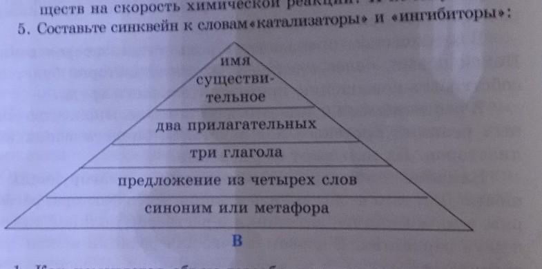 5. Составьте синквейн к словам «катализаторы» и «ингибиторы : имя существи- тельное два прилагательных три глагола предложение из четырех слов синоним или метафора В