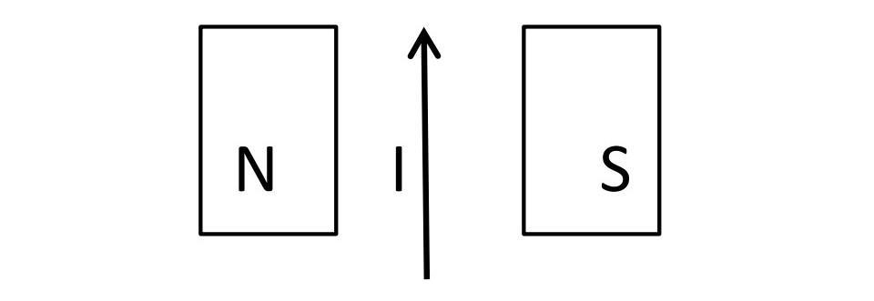 Линии индукции замыкаются от северного полюса N магнита к южному S. Направление тока I в проводнике указывает стрелка . Таким образом, нужно мысленно поместить левую руку между полюсами магнита так, чтобы ладонь была повернута к полюсу N (налево), а четыре пальца были направлены вверх. Тогда отогнутый большой палец покажет направление действия силы Ампера — от наблюдателя (нас).
