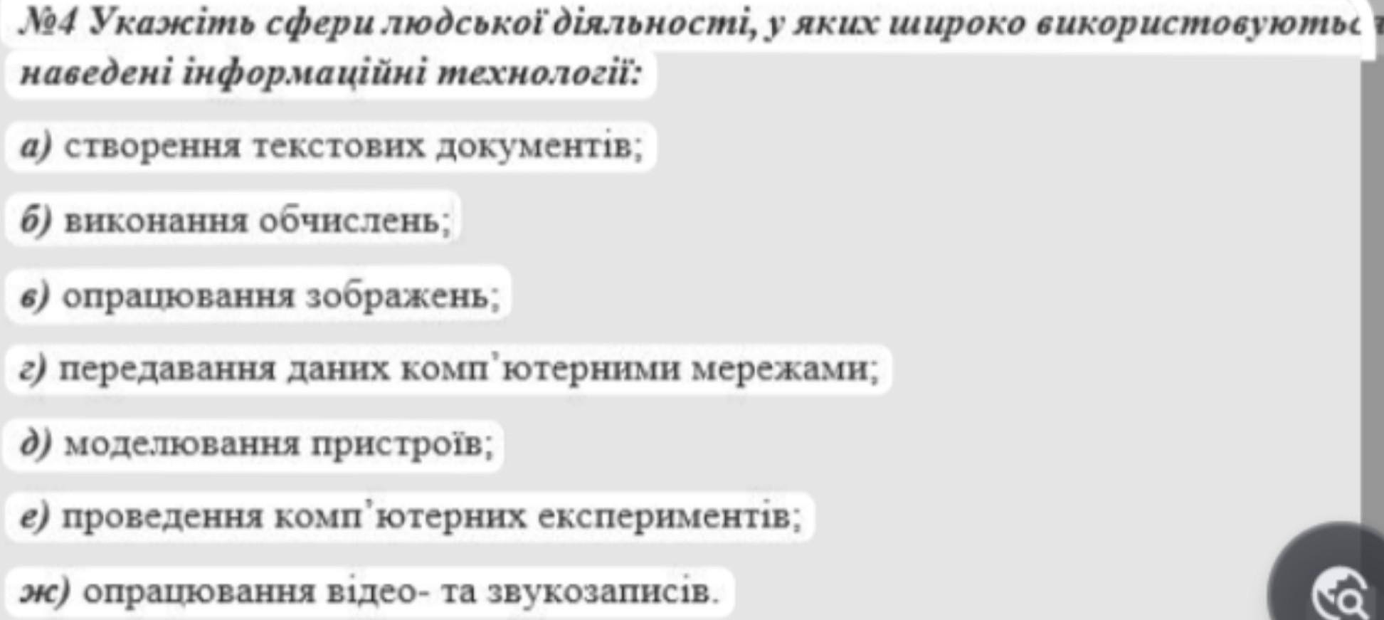 Укажiть сфери людської діяльності, у яких широко використовуються наведенi iнформацiйнi технології: